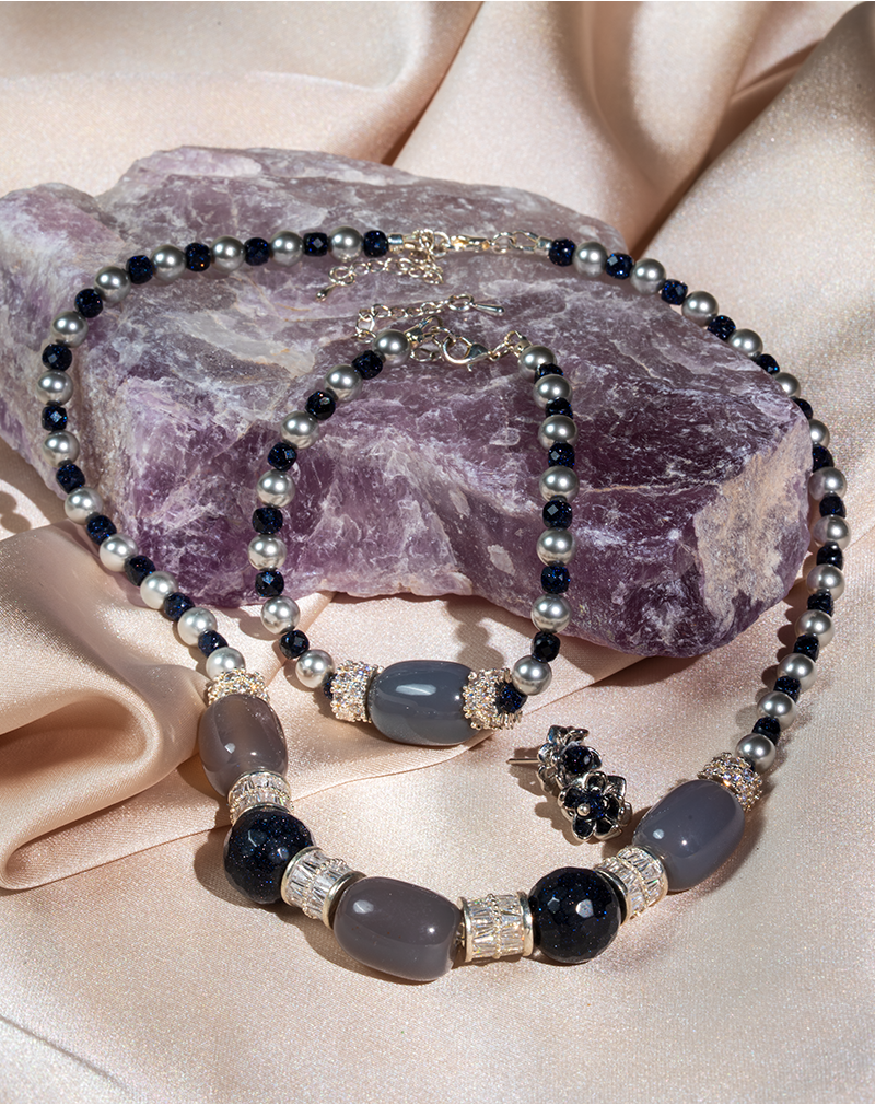 ست زیورآلات زنانه شوکا شامل گردنبند، دستبند و گوشواره با ترکیب سنگ عقیق طوسی، گلدستون سرمهای و مرواریدهای براق که با جزئیات فلزی نقرهای طراحی شده و جلوهای شیک و خاص ایجاد میکند.