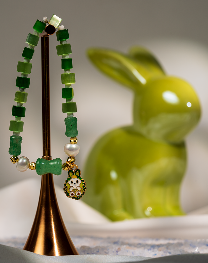 دستبند زنانه شوکا با سنستیک، آونتورین و مروارید سبز، آویز خرگوش طلایی