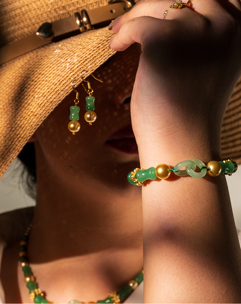ست آونتورین سبز طلوع شوکا شامل گردنبند، دستبند و گوشواره با ترکیب سنگ طبیعی آونتورین سبز و مرواریدهای ظریف است که در کنار مهرههای طلایی جلوهای گرم و چشمنواز ایجاد کرده و انتخابی شیک برای استایلهای روزمره و مهمانی محسوب میشود.