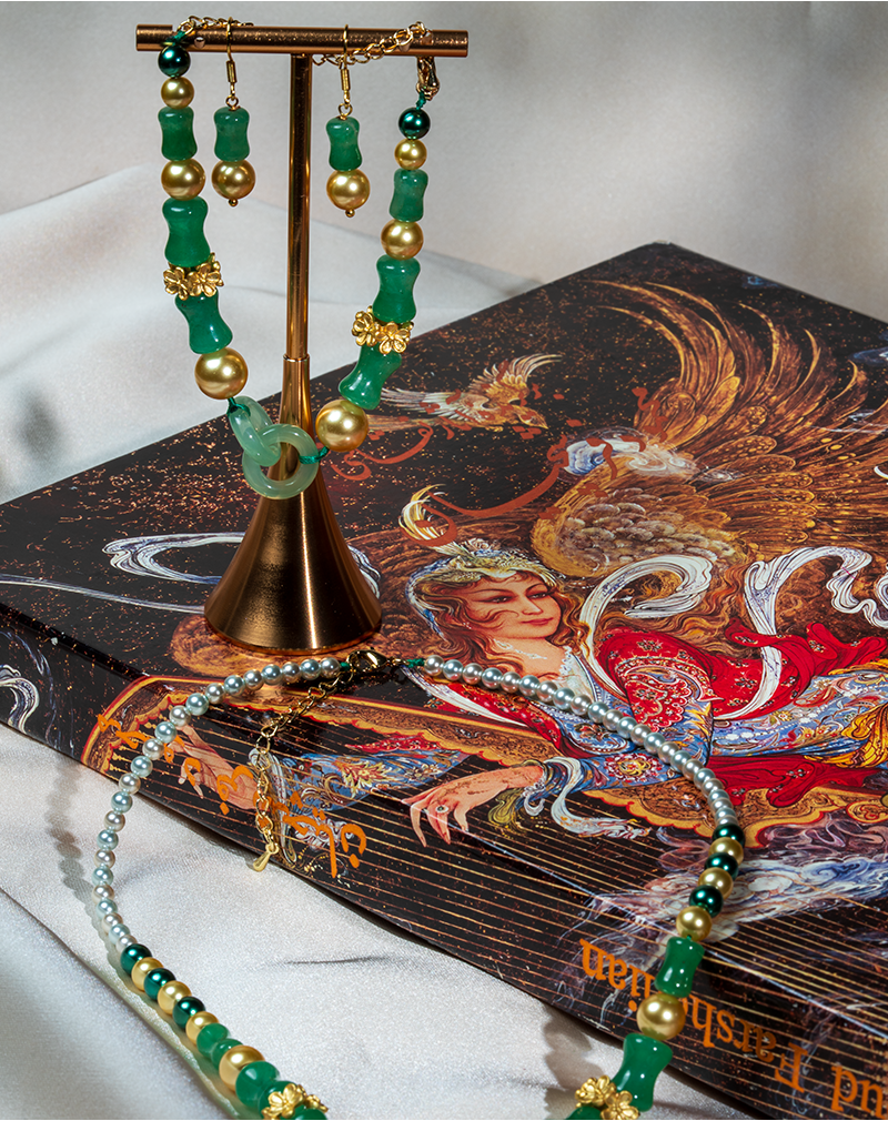 ست آونتورین سبز طلوع شوکا با الهام از طراوت طبیعت طراحی شده و ترکیبی زیبا از سنگ طبیعی آونتورین با رنگ سبز آرامشبخش و مرواریدهای لطیف را در کنار مهرههای طلایی ارائه میدهد. این ست شامل گردنبند، دستبند و گوشواره است که هماهنگی رنگهای سبز، طلایی و سفید در آن جلوهای کلاسیک و دلنشین ایجاد کرده است.