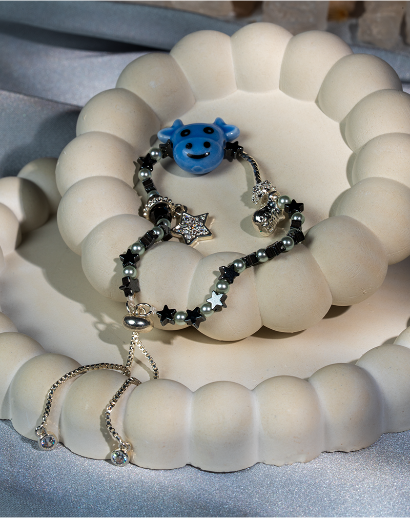 دستبند بچگانه شوکا با طراحی فانتزی و ترکیب هوشمندانه سنگهای حدید و مروارید مصنوعی، محصولی ظریف و جذاب برای کودکان است که هم از نظر زیبایی و هم از نظر کیفیت ساخت، استانداردهای لازم یک اکسسوری کودکانه را داراست. استفاده از مهرههای ستارهای حدید در کنار مرواریدهای مصنوعی با رنگ طوسی ملایم، هارمونی بصری متعادلی ایجاد کرده و آویز کارتونی آبیرنگ، جلوهای شاد و دوستداشتنی به دستبند بخشیده است.