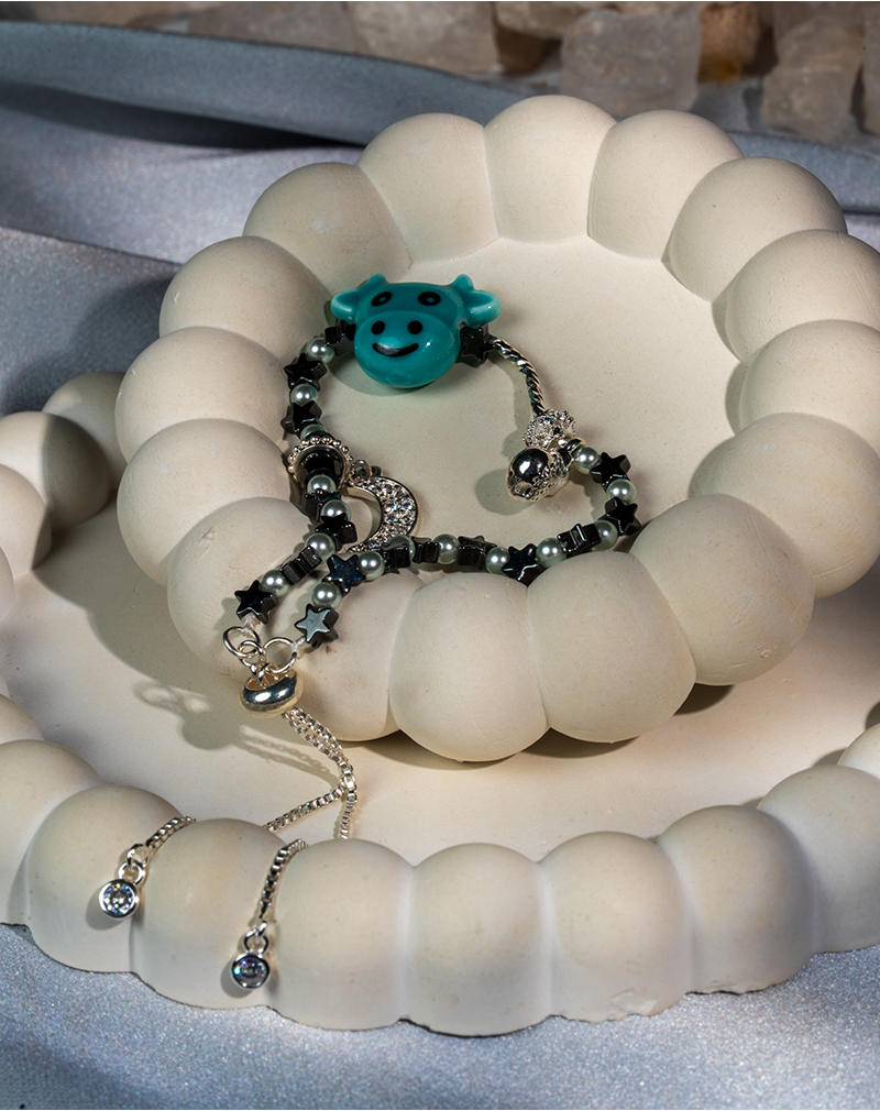 دستبند بچگانه شوکا مدل فیروزه فانتزی، نمونهای ظریف و دوستداشتنی از زیورآلات کودکانه است که با رعایت اصول طراحی ایمن و سبک تولید شده است. در ساخت این دستبند از ترکیب سنگ حدید طوسی و مروارید مصنوعی سفید استفاده شده که هماهنگی رنگی ملایم و چشمنوازی را ایجاد میکند. مهره فیروزهای فانتزی با طرح چهره کودکانه، نقطه کانونی طراحی بوده و حس شادابی و بازیگوشی را به محصول میبخشد.