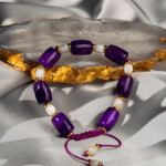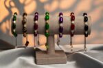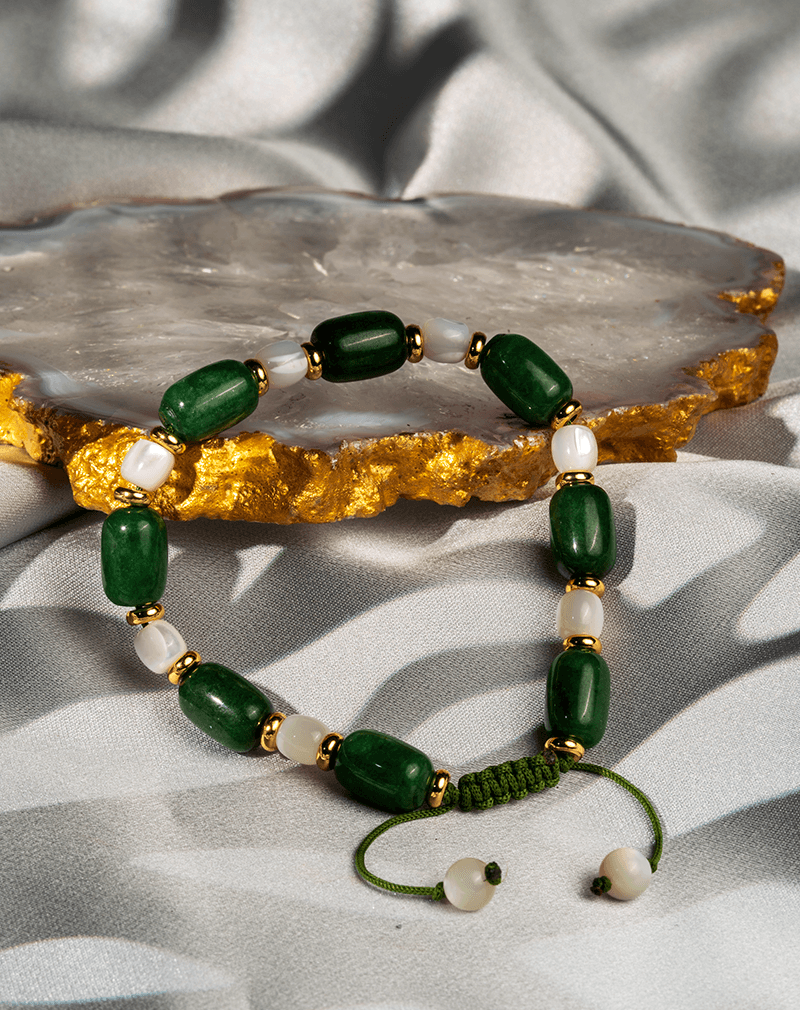 در کنار سنگ یشم، مهره‌های سفید جهت ایجاد کنتراست ملایم بصری و فاصله‌دهنده‌های فلزی طلایی‌رنگ استفاده شده است که مطابق کد GO محصول، به دستبند جلوه‌ای ظریف و شیک می‌بخشند. زیرکار این دستبند از نخ بافتی سبز مقاوم تشکیل شده که به‌صورت گره‌ای اجرا شده و امکان تنظیم سایز را فراهم می‌کند.