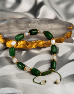 دستبند مردانه جید سبز با تزئینات طلایی‌رنگ و بند قابل تنظیم، طراحی ساده، دست‌ساز و مناسب استفاده روزمره.