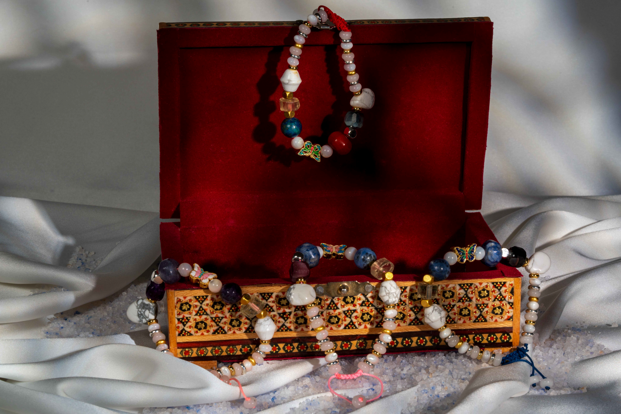 این دستبند دستساز نوجوان از ترکیب سنگهای طبیعی سودالیت آبی، تورمالین، هائولیت سفید و صدف طبیعی طراحی و ساخته شده است. سنگ سودالیت به عنوان نماد آرامش ذهنی و افزایش تمرکز شناخته میشود و در کنار تورمالین که به ایجاد تعادل انرژی و ثبات احساسی کمک میکند، ترکیبی هماهنگ و متعادل ایجاد مینماید. هائولیت سفید با خاصیت کاهش تنش و استرس، لطافت بصری و حس آرامش را تقویت کرده و استفاده از صدف طبیعی، جلوهای روشن، ظریف و صدفیرنگ به این دستبند بخشیده است. این ترکیب سنگها، هویتی آرام، شاد و متناسب با روحیه نوجوانان برای محصول ایجاد کرده است.