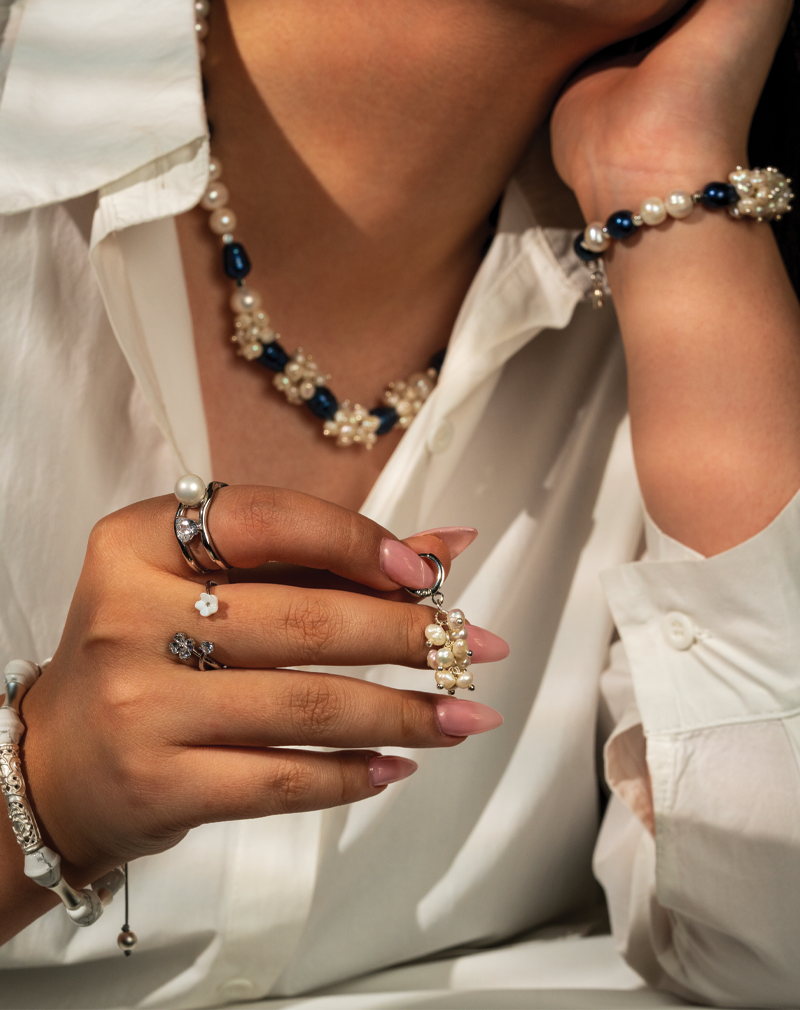 مروارید از گذشته نماد ظرافت، پاکی و آرامش بوده و استفاده از آن در زیورآلات همواره حس اصالت و زیبایی کلاسیک را منتقل میکند. ترکیب آن با رنگ سرمهای نیز جلوهای اشرافی ایجاد میکند که برای مجالس، مهمانیها و استایلهای رسمی بسیار مناسب است.