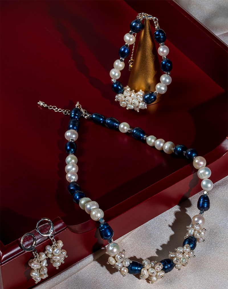 در طراحی گردنبند از ترکیب مرواریدهای طبیعی گرد و مهرههای سرمهای استفاده شده که به صورت متناوب در کنار هم قرار گرفتهاند. در بخشهایی از گردنبند و دستبند، خوشههای کوچک مروارید قرار گرفته که جلوهای ظریف و متفاوت به طراحی میبخشند و باعث میشوند این ست جلوهای خاص و هنری داشته باشد.