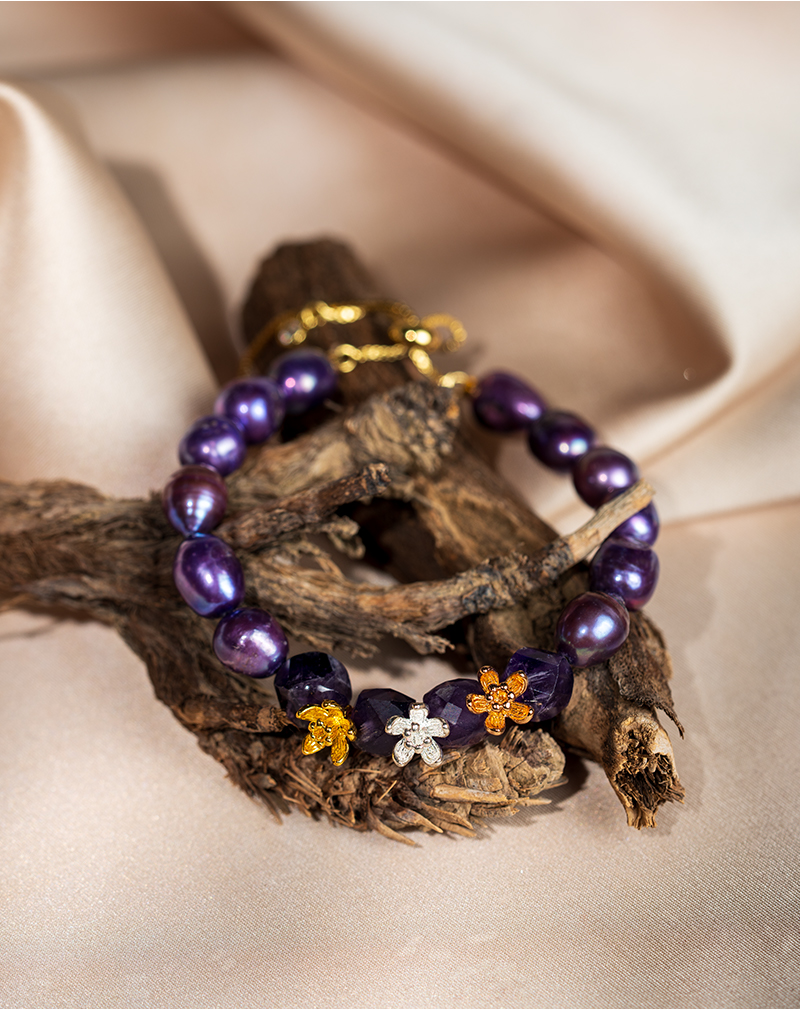 دستبند زنانه شوکا با ترکیب مرواریدهای بنفش و سنگ طبیعی آمیتیست طراحی شده و با پلاکهای گل طلایی جلوهای خاص و چشمگیر پیدا کرده است. آمیتیست از سنگهای شناختهشده برای ایجاد آرامش ذهنی، کاهش استرس و تقویت تمرکز است و در کنار مروارید حس ظرافت و زیبایی کلاسیک را به استایل شما اضافه میکند.