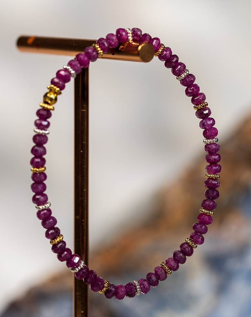 دستبند زنانه شوکا ساخته‌شده از مهره‌های تراش‌خورده یاقوت سرخ بنفش، نماد انرژی، اعتمادبه‌نفس و قدرت درونی است. این سنگ ارزشمند از دیرباز به‌عنوان سنگ شجاعت و نشاط شناخته می‌شود و انتخابی عالی برای استفاده روزمره و استایل‌های ظریف زنانه است.