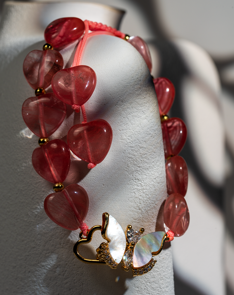 این دستبند زنانه شوکا با سنگهای طبیعی کوارتز صورتی و برش قلبیشکل طراحی شده است؛ سنگی که به عنوان نماد عشق و آرامش شناخته میشود. ترکیب رنگ صورتی لطیف با آویز پروانه طلایی نگیندار، جلوهای زنانه، احساسی و بسیار دلنشین به این مدل بخشیده است.