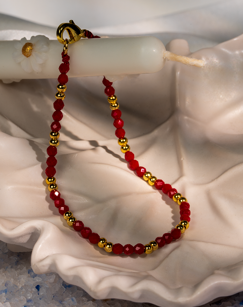 دستبند زنانه شوکا با مهره قرمز و گویهای طلایی