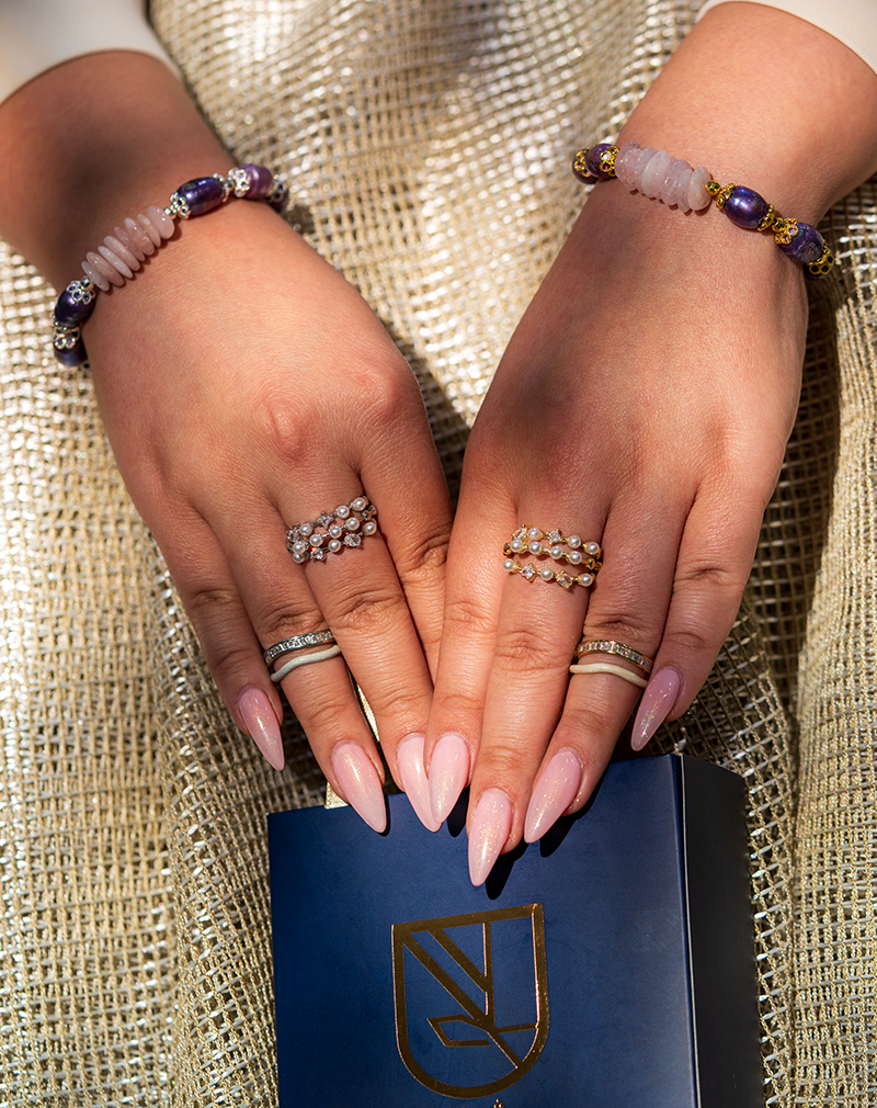این دستبند زنانه خاص از برند شوکا با ترکیب سنگ رز کوارتز طبیعی و مرواریدهای بنفش صدفی طراحی شده است. تضاد رنگی لطیف رز کوارتز با درخشش عمیق مرواریدها، جلوه‌ای زنانه و اشرافی ایجاد می‌کند که با اتصالات و آویز نقره‌ای تکمیل شده است.