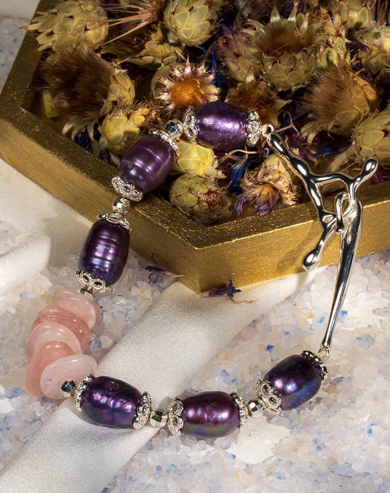 دستبند زنانه شوکا با سنگ رز کوارتز و مروارید بنفش، آویز صلیب نقره‌ای