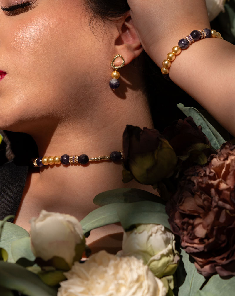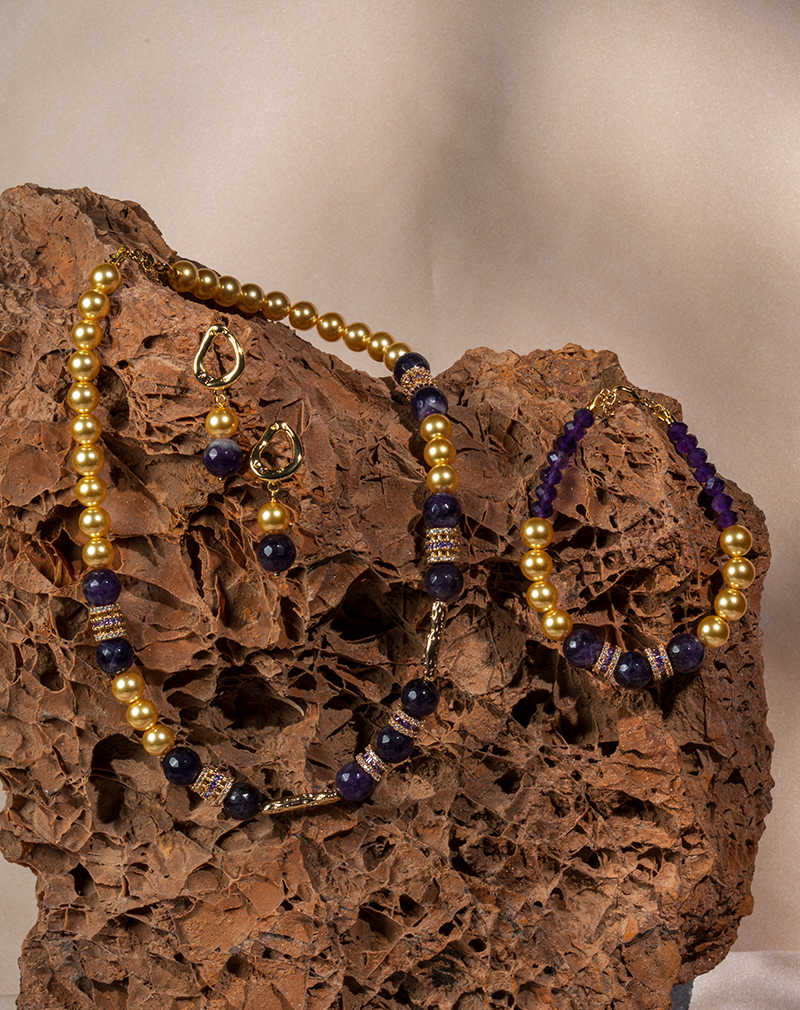 ست آمتیست سلطنتی شوکا با ترکیبی از آمتیست طبیعی، آمتیست رویال و مروارید کرمی، جلوهای لوکس، چشمگیر و کاملاً متمایز ایجاد کرده است. این ترکیب بنفش و طلایی، هویتی سلطنتی و زنانه به استایل شما میبخشد.