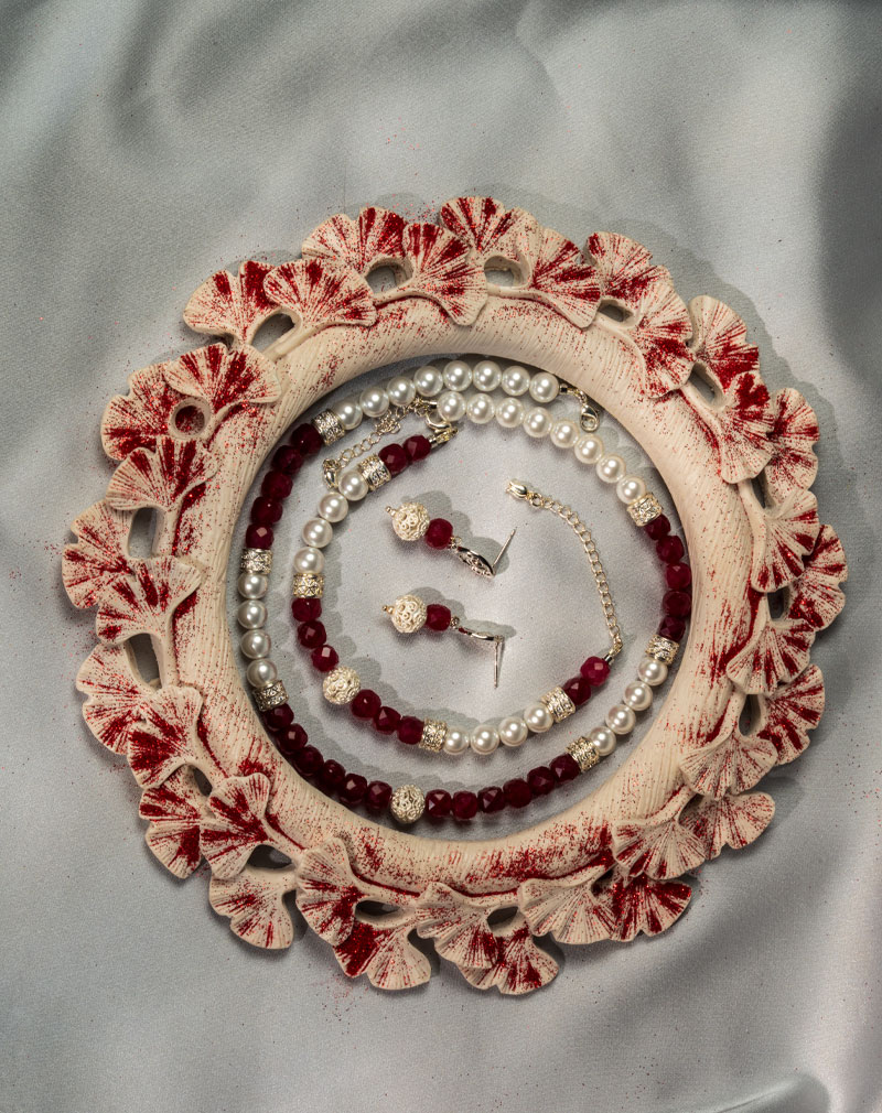 رنگ قرمز عمیق یاقوت نماد قدرت، عشق و شور است و در کنار سفیدی لطیف مروارید، تضادی هنری و چشمگیر ایجاد میکند.