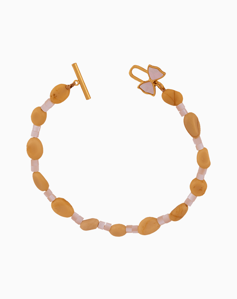 دستبند زنانه شوکا ساختهشده از سنگ اونتورین زرد و مهرههای صدف مات با قفل T-Bar طلایی؛ سبک، زیبا، مناسب استایلهای روزمره و مینیمال.