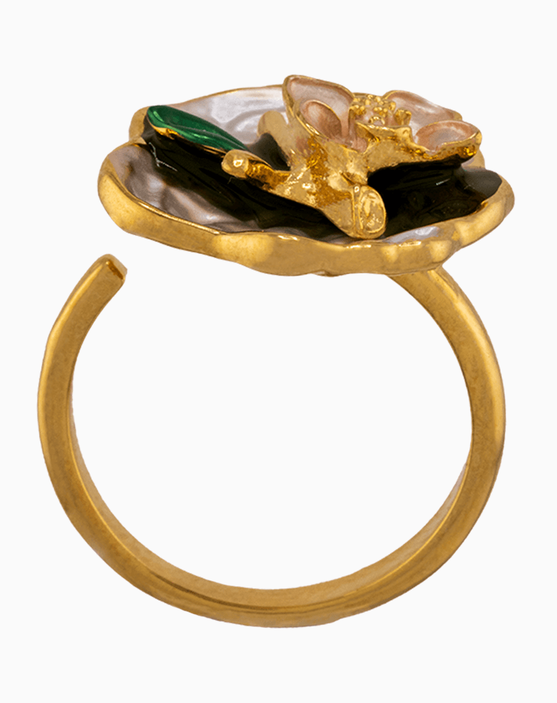 ترکیب رنگ طلایی حلقه با برق صدف و درخشندگی گل، نمایی از ظرافت طبیعت را به انگشت شما میآورد.