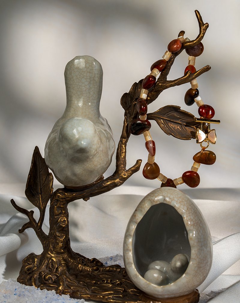 خواص سنگ جاسپر شامل افزایش ثبات احساسی، آرامش ذهن، رفع اضطراب، تقویت اراده و ایجاد حس تعادل است؛ و صدف طبیعی با ارتعاش ملایم خود باعث ایجاد آرامش، انرژی زنانه، پاکی و لطافت میشود.