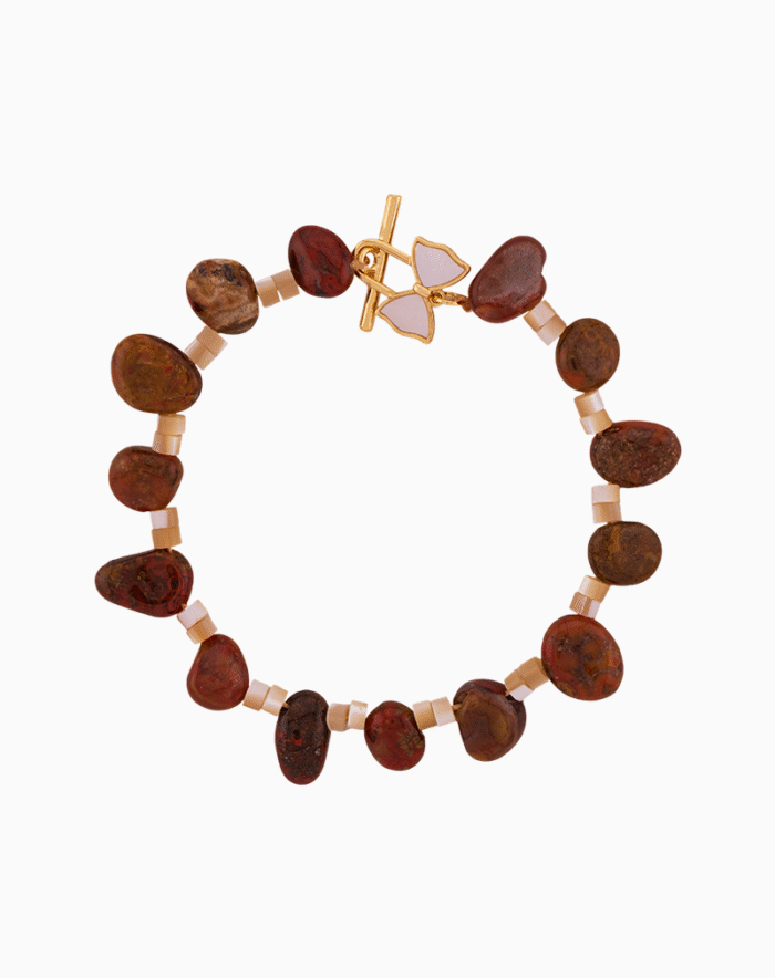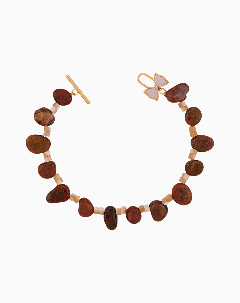 دستبند زنانه شوکا با ترکیبی از مهرههای طبیعی جاسپر در طیف قهوهای–قرمز و مهرههای کوچک صدف کرمرنگ ساخته شده است. فرم نامنظم سنگهای جاسپر حس اصالت و انرژی طبیعی را منتقل میکند و در کنار صدف مات، هارمونی رنگی گرم و آرامشبخش ایجاد میکند. قفل طلایی T-Bar با تزئین مینای صورتی جلوهای ظریف و زنانه به دستبند میبخشد. این دستبند انتخابی عالی برای استایلهای بوهو، مینیمال و طبیعی است و به دلیل استفاده از متریال طبیعی، جلوهای خاص، دستساز و منحصربهفرد دارد.