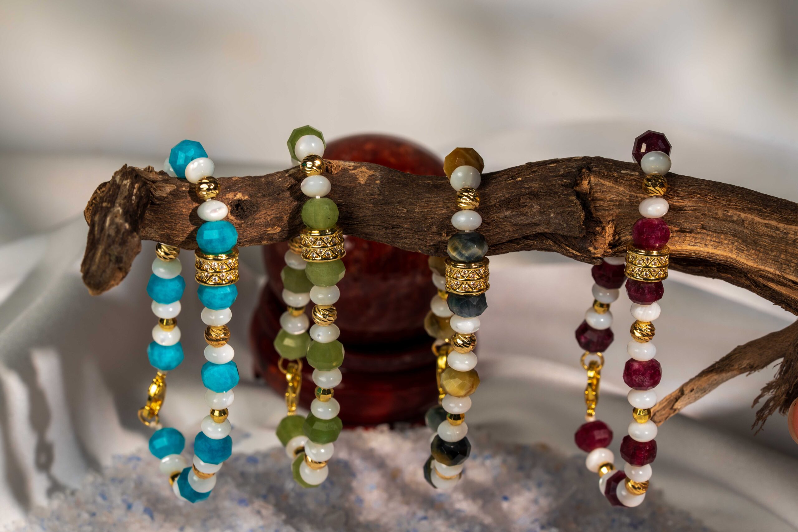 دستبند زنانه شوکا با سنگ آپاتیت آبی و صدف سفید، طراحی دستساز با اتصالات طلایی و استایلی خنک و آرام.