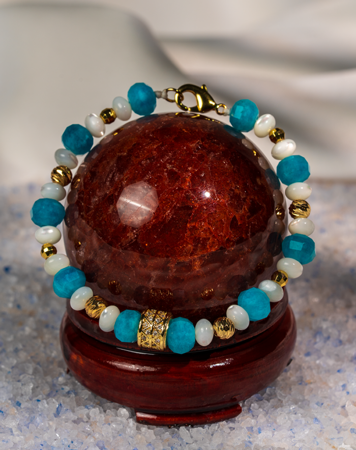 این دستبند زنانه شوکا با ترکیبی چشمنواز از سنگ آپاتیت آبی و مهرههای صدف سفید طراحی شده است. رنگ آبی شفاف آپاتیت در کنار سفیدی لطیف صدف و جزئیات طلایی، جلوهای آرام، شاداب و بسیار شیک ایجاد کرده است.