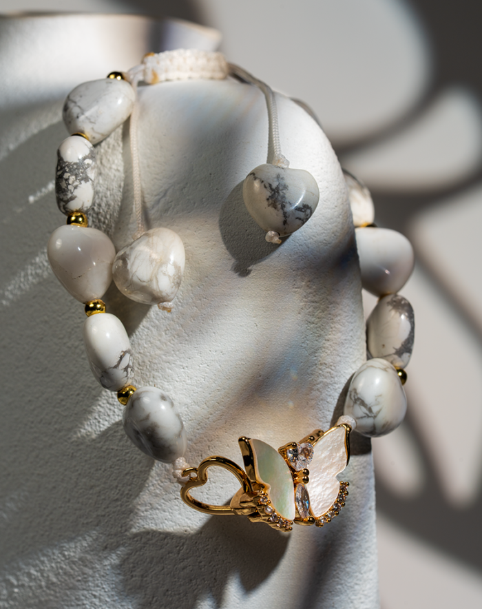 این دستبند زنانه شوکا با استفاده از سنگ طبیعی هائولیت سفید و رگههای طوسی ظریف طراحی شده است. ترکیب رنگ سفید سنگها در کنار آویز پروانه طلایی، جلوهای لطیف، مینیمال و بسیار آرام به این اکسسوری بخشیده است.