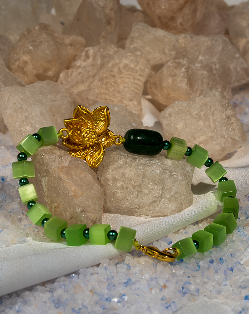 دستبند زنانه شوکا با آویز گل لوتوس طلایی، سنگ یشم و مهرههای سنتتیک سبز