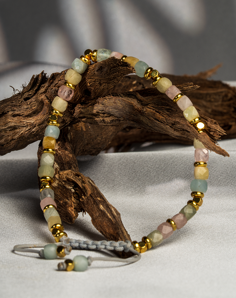 دستبند زنانه شوکا با سنگ مورگانیت چندرنگ پاستلی، طراحی دستساز و بند قابل تنظیم؛ انتخابی لطیف و آرامشبخش برای استفاده روزمره.