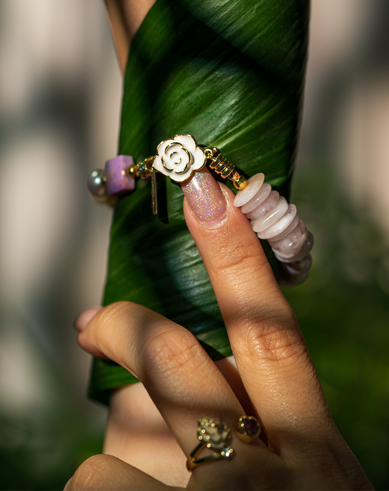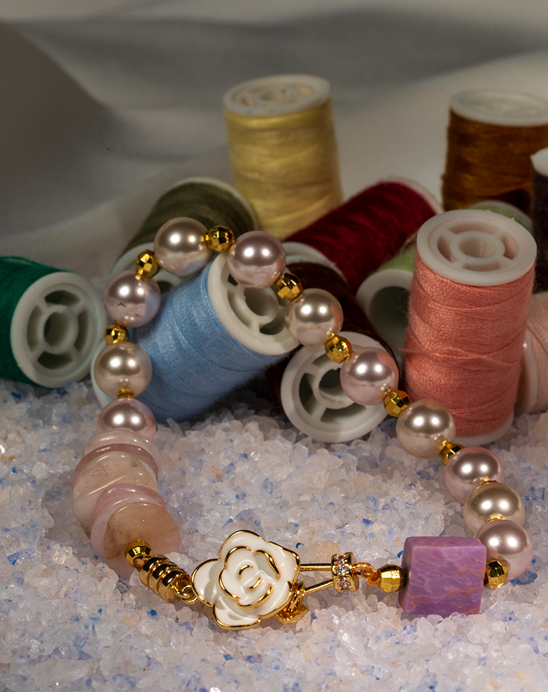 دستبند زنانه شوکا با آویز گل طلایی، رزکوارتز، فسفوسیدریت و مروارید مصنوعی
