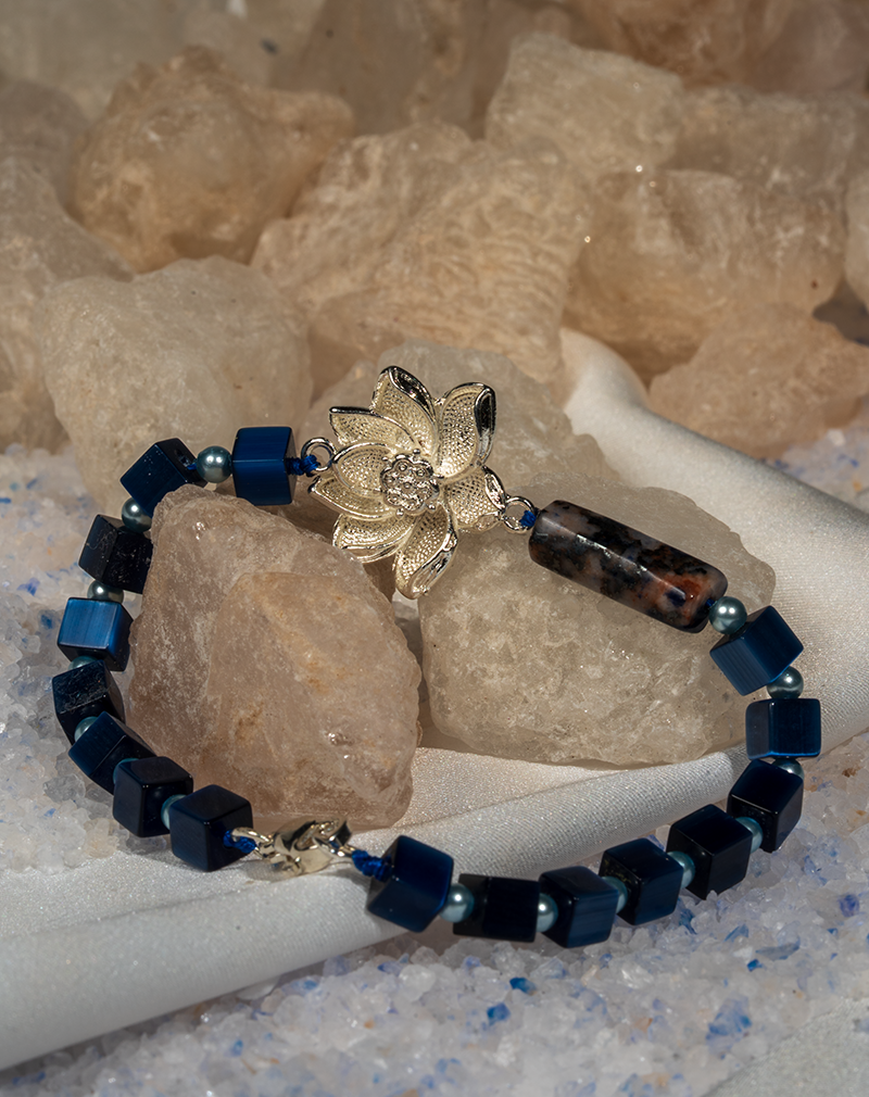 دستبند زنانه شوکا با آویز گل لوتوس نقره‌ای، سنگ سودالیت و مهره‌های سنتتیک