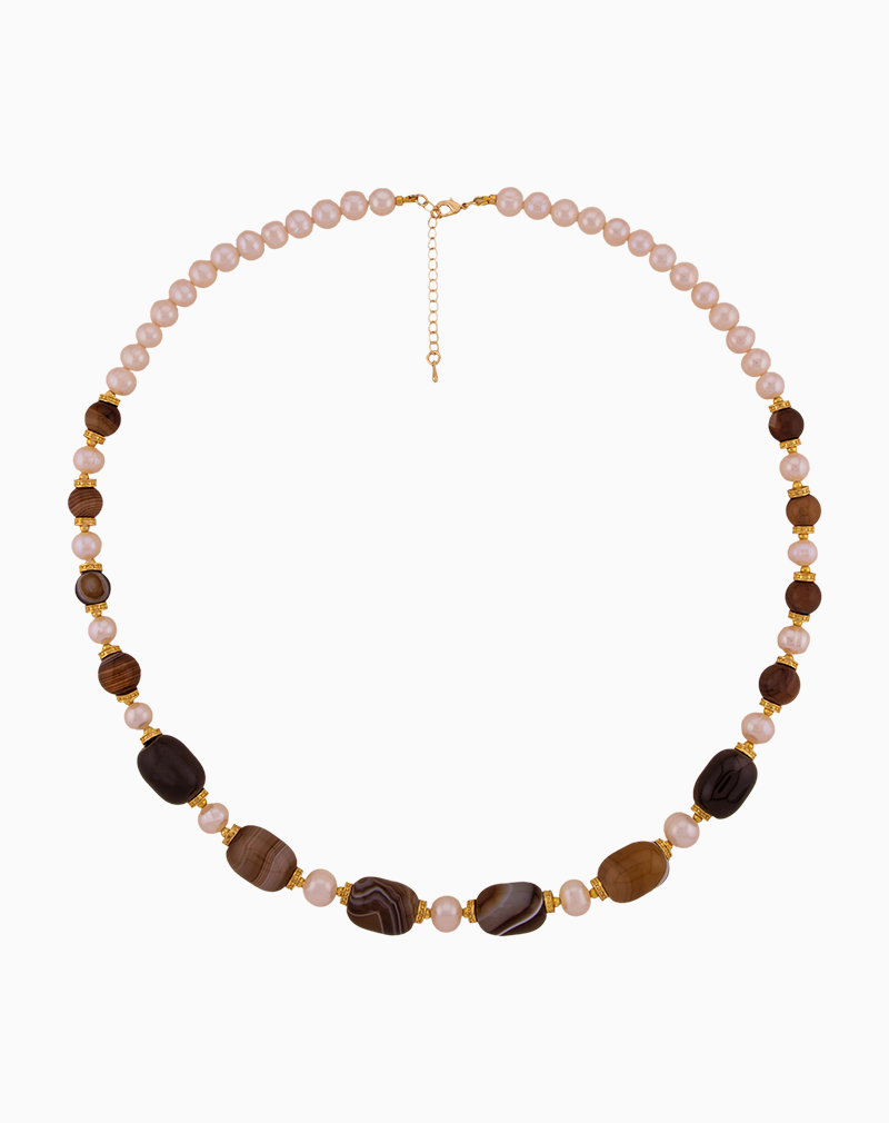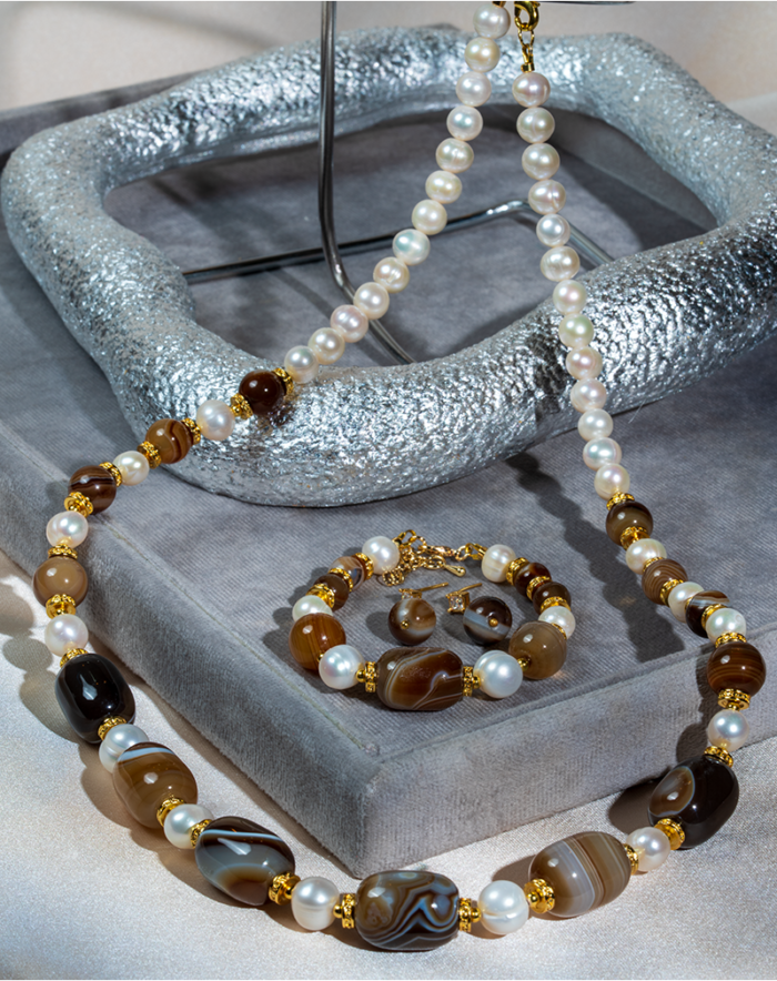 ترکیب گرم عقیق با درخشش لطیف مروارید، جلوه‌ای چشم‌نواز و کلاسیک ایجاد کرده که استایل شما را در مهمانی‌ها و مراسم رسمی برجسته می‌سازد.