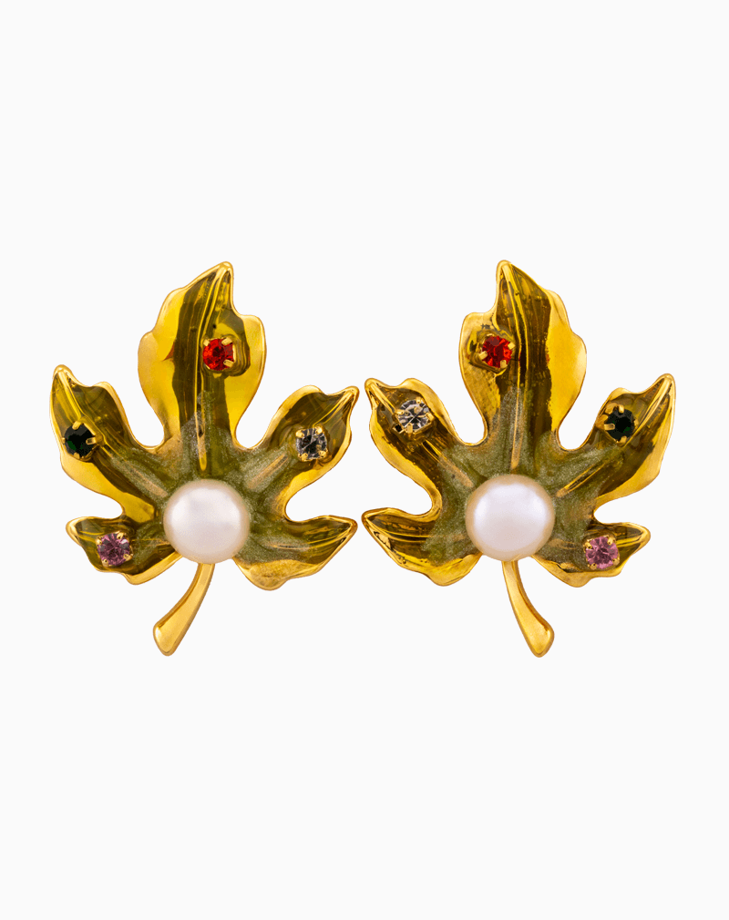 گوشواره میخی شوکا مدل برگ پاییزی میناکاری با مروارید