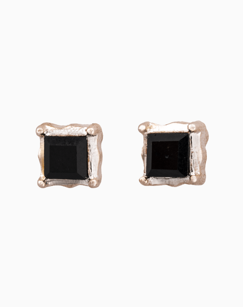 گوشواره میخی مدرن شوکا با نگین مشکی مستطیلی و قاب نقرهای بافتدار. انتخابی شیک، مینیمال و ایدهآل برای استایلهای روزمره آقایان و بانوان.