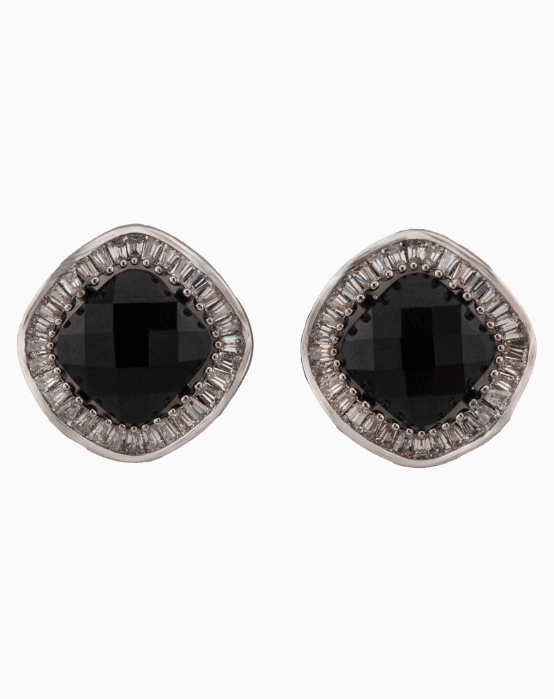 گوشواره میخی زنانه شوکا مدل سنگ مشکی تراشدار با قاب نقرهای نگیندار