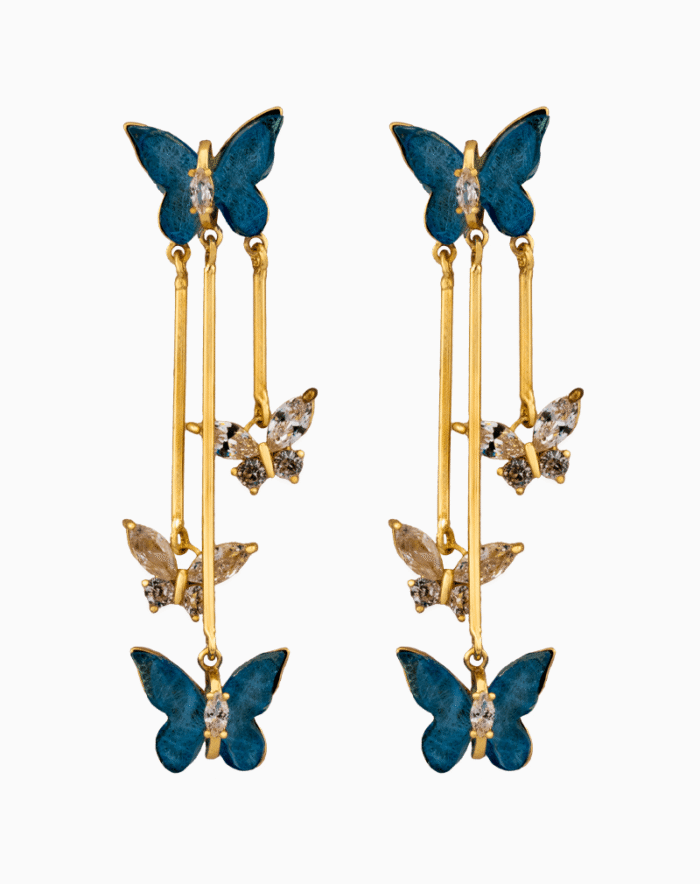 از این پایه، سه رشته آویز طلاییرنگ با طولهای نامتقارن آویزان شدهاند که جلوهای مدرن به طرح میبخشد. دو رشته به پروانههایی کوچکتر و ظریفتر ختم میشوند که بالهای آنها با نگینهای کریستالی درخشان (زیرکونیا) با تراش مارکیز تزئین شدهاند. بلندترین رشته نیز یک پروانه آبی دیگر را در انتهای خود جای داده و یک توازن بصری زیبا میان رنگ و درخشش ایجاد میکند.