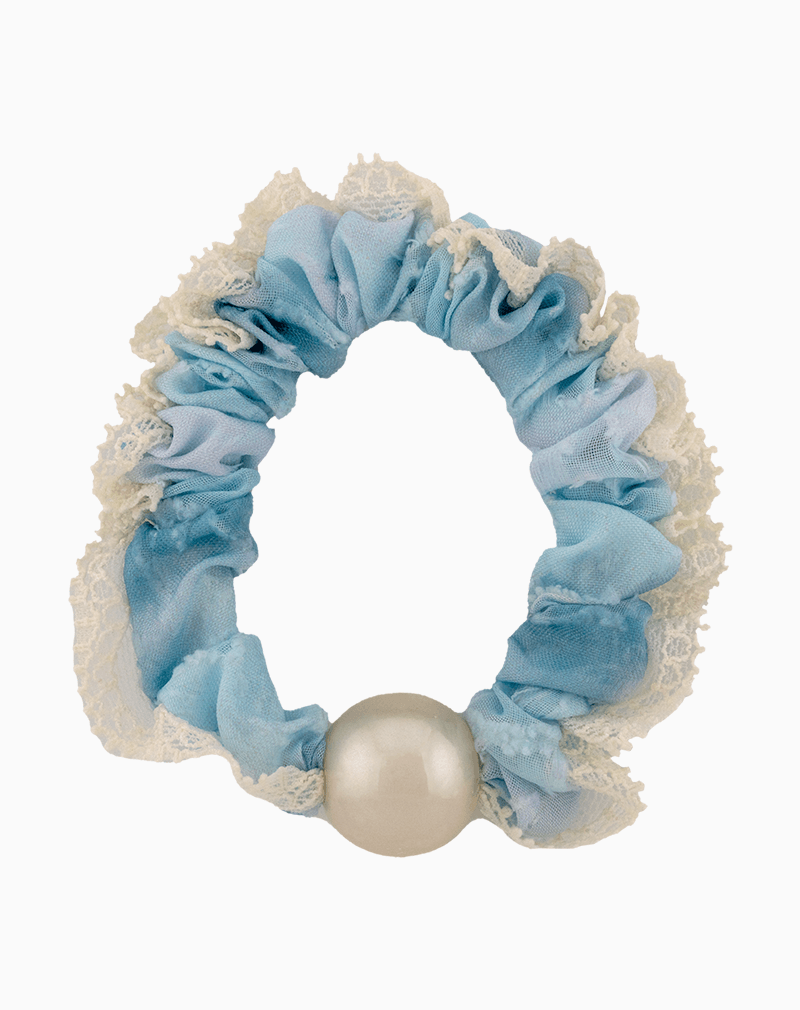 اسکرانچی موی رمانتیک و خاص از برند شوکا، با پارچه طرح آبرنگی آبی، حاشیه دانتل کرم و یک مروارید درشت. انتخابی ایدهآل برای افزودن حسی لطیف و هنری به استایل شما.