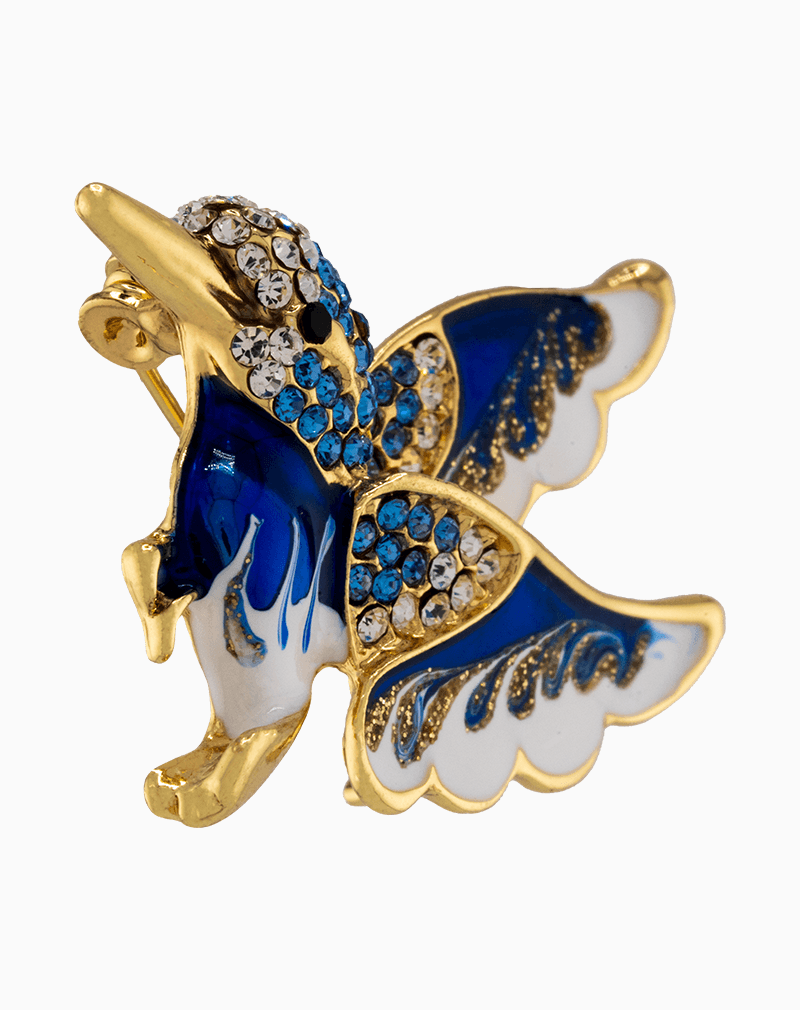 طراحی هنری پرنده با رنگبندی کلاسیک آبی و طلایی، نگینکاری درخشان آبی و سفید، جزئیات اکلیلی روی بالها، قابلیت استفاده دوکاره به عنوان سنجاق سینه و آویز گردنبند. |