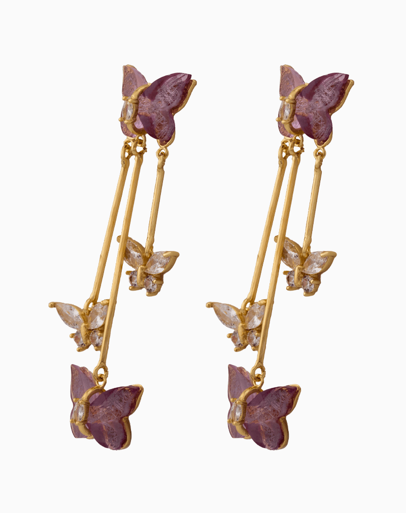 از این پروانه، سه رشته آویز طلایی با طولهای متفاوت و نامتقارن سرازیر شدهاند. دو آویز به پروانههایی کوچکتر و ظریفتر ختم میشوند که بالهایشان با نگینهای کریستالی شفاف و درخشان با تراش مارکیز (Marquise) تزئین شده است. بلندترین آویز نیز یک پروانه بنفش دیگر را در انتهای خود حمل میکند و یک هارمونی زیبا از رنگ و درخشش را به وجود میآورد.