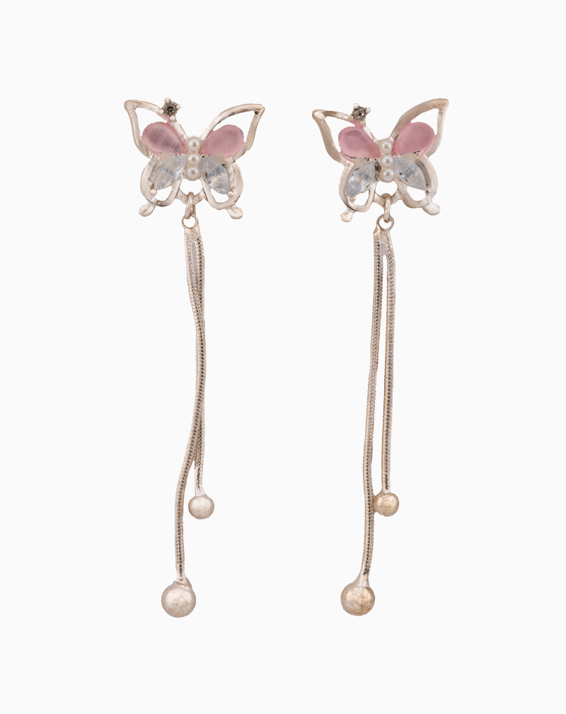 طراحی پروانه با نگینهای صورتی و کریستالی, آویزهای بلند و ظریف زنجیری |