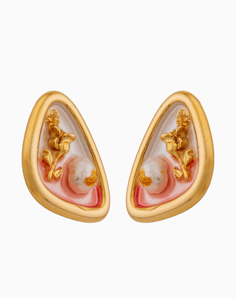 این گوشوارههای میخی از برند شوکا، تلفیقی استادانه از هنر کلاسیک و طراحی مدرن هستند. هر گوشواره مانند یک تابلوی نقاشی کوچک، داستانی رمانتیک را روایت میکند. در مرکز یک قاب مثلثی با آبکاری طلا، یک فرشته کوچک (کروبی) به همراه یک مروارید طبیعی درخشان، در بستری از رزین با طیف رنگی صورتی و صدفی قرار گرفتهاند. جزئیات سه بعدی و درخشش ذرات طلایی روی مروارید، به این قطعه عمق و جلوهای لوکس بخشیده است. این گوشواره ضد حساسیت بوده و برای کسانی که به دنبال زیورآلاتی فراتر از یک اکسسوری ساده و در جستجوی یک اثر هنری خاص هستند، انتخابی ایدهآل است. |