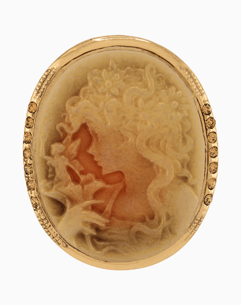 طراحی هنری کامئو (Cameo) با جزئیات بالا، قاب طلایی تزئین شده با کریستالهای شامپاینی. |