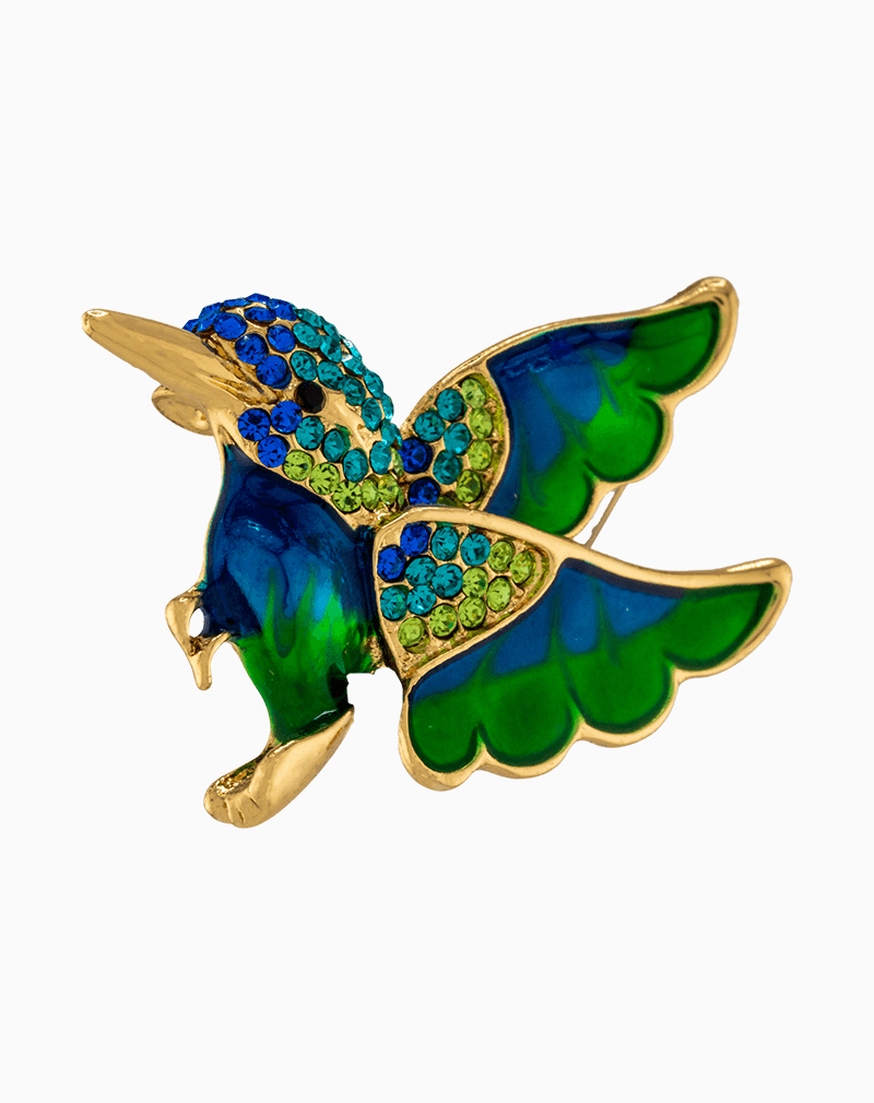 سنجاق سینه و آویز دوکاره شوکا با طرح زیبای یک پرنده در حال پرواز. این قطعه هنری با میناکاری آبی و سبز و نگینهای کریستالی درخشان بر روی زمینهای با آبکاری طلا، جلوهای بینظیر به استایل شما میبخشد.