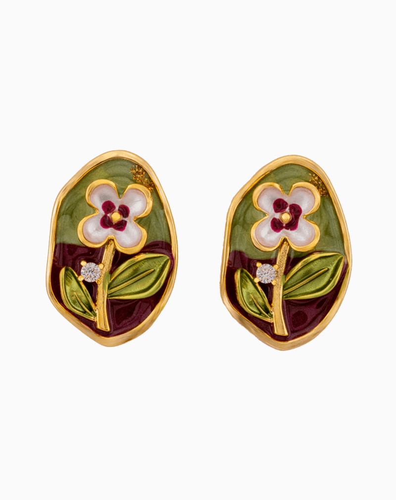 یک باغچه کوچک هنری بر روی گوش شما! گوشواره میخی دست ساز شوکا با طراحی گل میناکاری شده و جزئیات ظریف، انتخابی خاص برای درخشش استایل شماست.