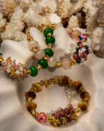 دستبند زنانه شوکا مدل جید سبز نمونهای از زیبایی دستساز، تلفیق هنر رنگ و بافت است. مهرههای طبیعی سنگ جید سبز در کنار کریستالهای رز و سفید، ترکیبی ویژه از لطافت و انرژی مثبت خلق میکنند.