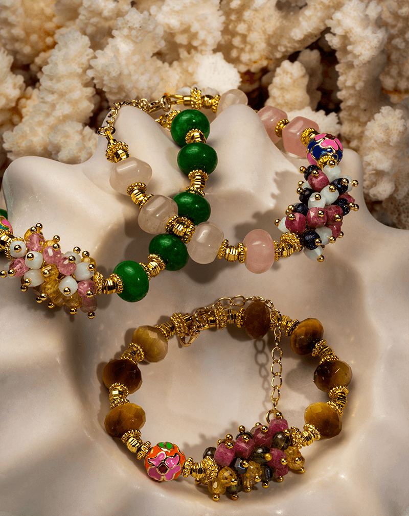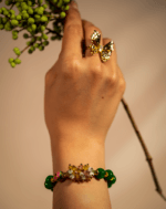 دستبند زنانه شوکا مدل جید سبز با ترکیبی از مهرههای سبز زمردی، کریستالهای رز و اتصال طلایی صیقلی، جلوهای چشمنواز و اصیل دارد. طراحی خاص و پیچیده آن با الهام از طبیعت ساخته شده و بهکمک زنجیر انتهایی برای هر مچ دستی قابل تنظیم است.