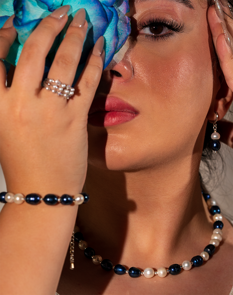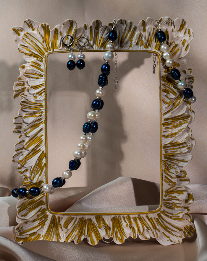 • ست زنانه مهتاب دریایی از برند شوکا، با الهام از آرامش شب‌های ساحلی و درخشش مهتاب بر سطح دریا طراحی شده است. در این ست، مرواریدهای طبیعی و پرورشی با طیف رنگی سرمه‌ای عمیق و سفید درخشان در کنار هم قرار گرفته‌اند تا ترکیبی متعادل، اشرافی و ماندگار ایجاد کنند.
