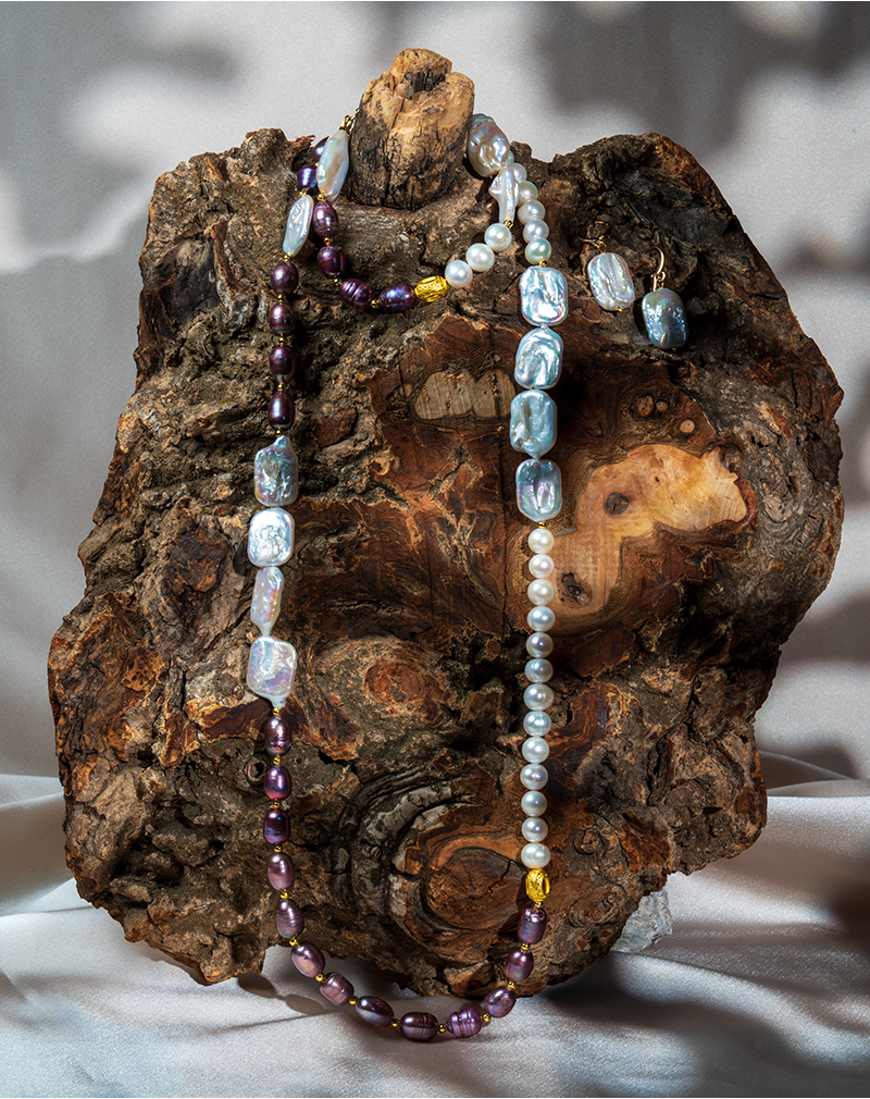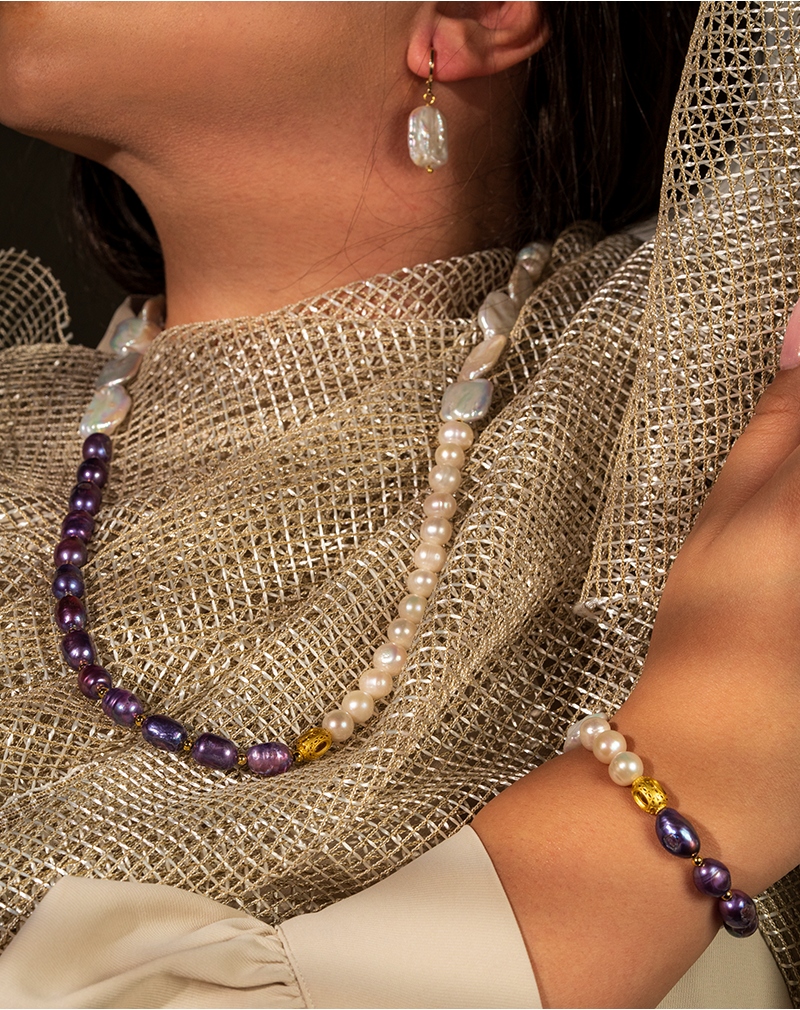 حضور مرواریدهای باروک صدفی با انعکاسهای آبی–صورتی، در کنار مرواریدهای بیضی بنفش و مرواریدهای کروی سفید، ترکیبی از اصالت، جلوهی هنری و وقار زنانه را بهوجود آورده است. این تضاد رنگی چشمنواز بین سفید صدفی و بنفش تیره، احساسی از رمزآلودگی و شکوه شبانه را تداعی میکند.