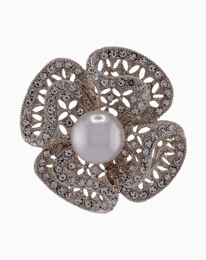 طراحی کلاسیک گل چهارپر با گلبرگ‌های شبکه‌ای، حاشیه‌های نگین‌کاری شده با کریستال و مرکز مرواریدی درشت با آبکاری نقره‌ای.