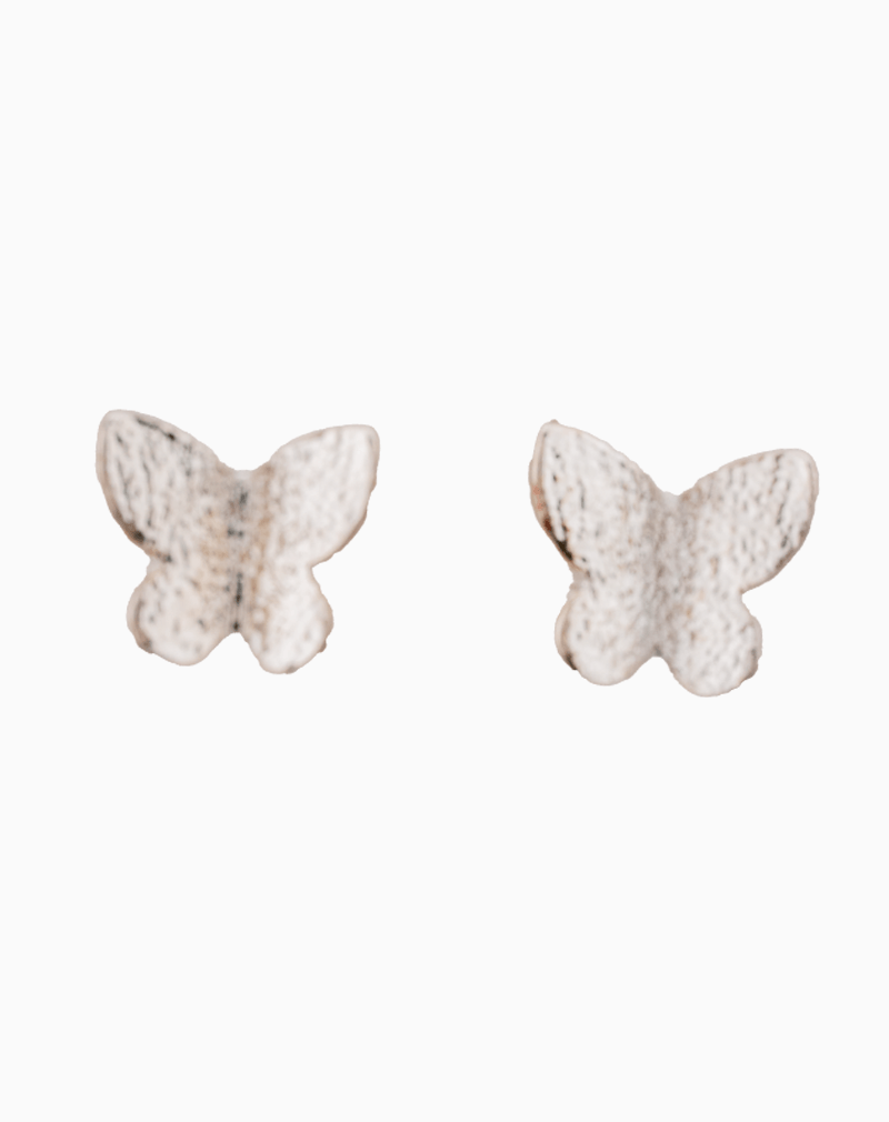گوشواره میخی مینیمال شوکا به شکل پروانههای کوچک و ظریف. این گوشوارهها با سطح نقرهای مات و بافتدار، انتخابی ایدهآل برای استایلهای ساده و روزمره هستند.
