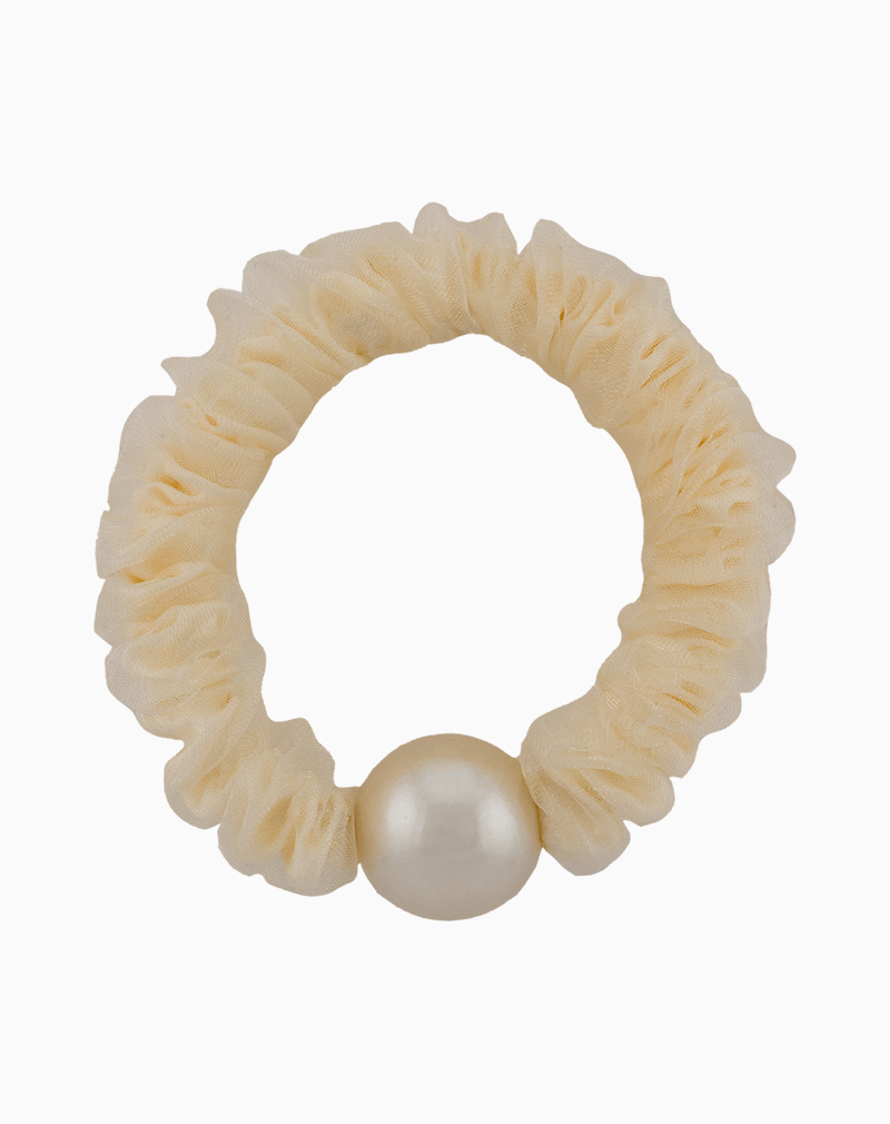اسکرانچی موی ظریف و رمانتیک از برند شوکا، ساخته شده از پارچه توری به رنگ کرم روشن و تزئین شده با یک مروارید درشت و زیبا. انتخابی ایدهآل برای افزودن لطافت به استایل شما.